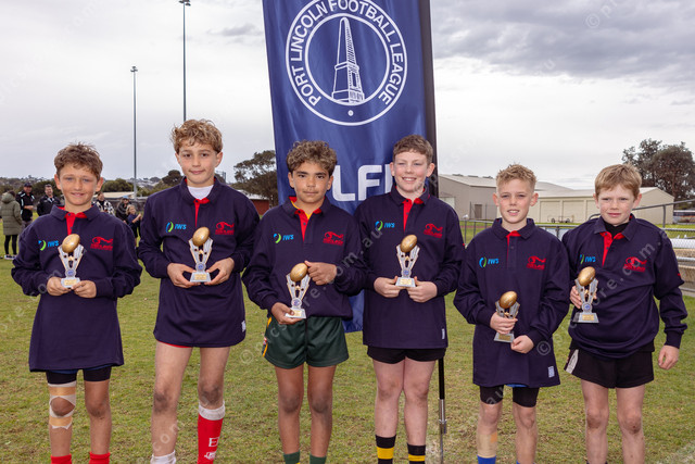 Best and fairest trophy winners: Nate Castley (Wayback), Bodhi Woodstock-Swaffer (Tasman Imperial), Fred Agius (Mallee Park), Jhye Stimson (Boston), Dion Manthorpe (Lincoln South) and Jonty Meyers (Marble Range). (498782_03)