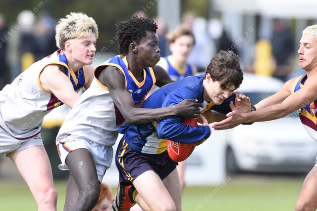 Steward Oling (4 Warragul Industrials, left) grabbs Jacob Brown (9 Inverloch-Kongwak, with the ball). 504164_34