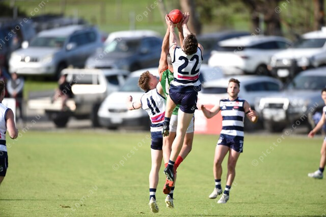 Jacob Keysers (22 NNG) marks over Shane Savage (12 Tooradin), left is Kyle O’Sullivan (11). 504161_35