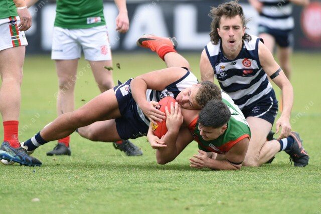Riley Sutherland (50 NNG) with the ball, Anthony Mirauta (48 Tooradin). 504162_22