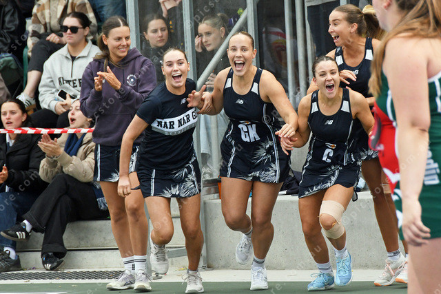 Romi Esler, Lucy Watts, Zoe Haringsma, Shayla Dale and Emily Kerr storm the court after Nar Nar Goon’s win in the B Grade grand fina l504168_25