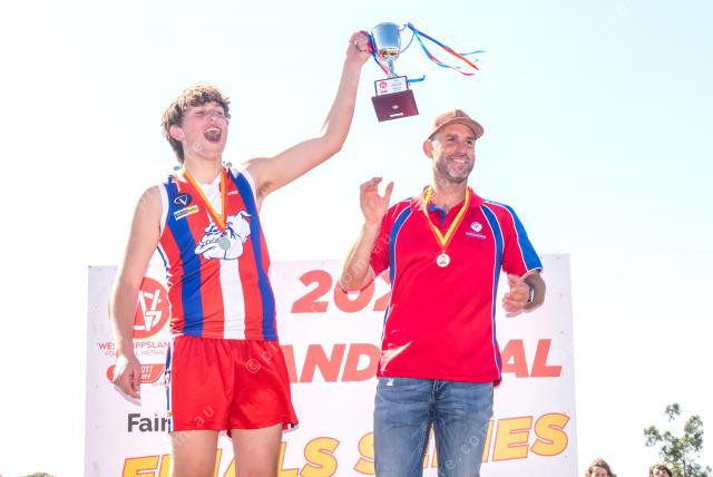 Philip Island captain Finn O’Brien hoists the fourths premiership cup with coach Steve Duggan by his side. 361008_02