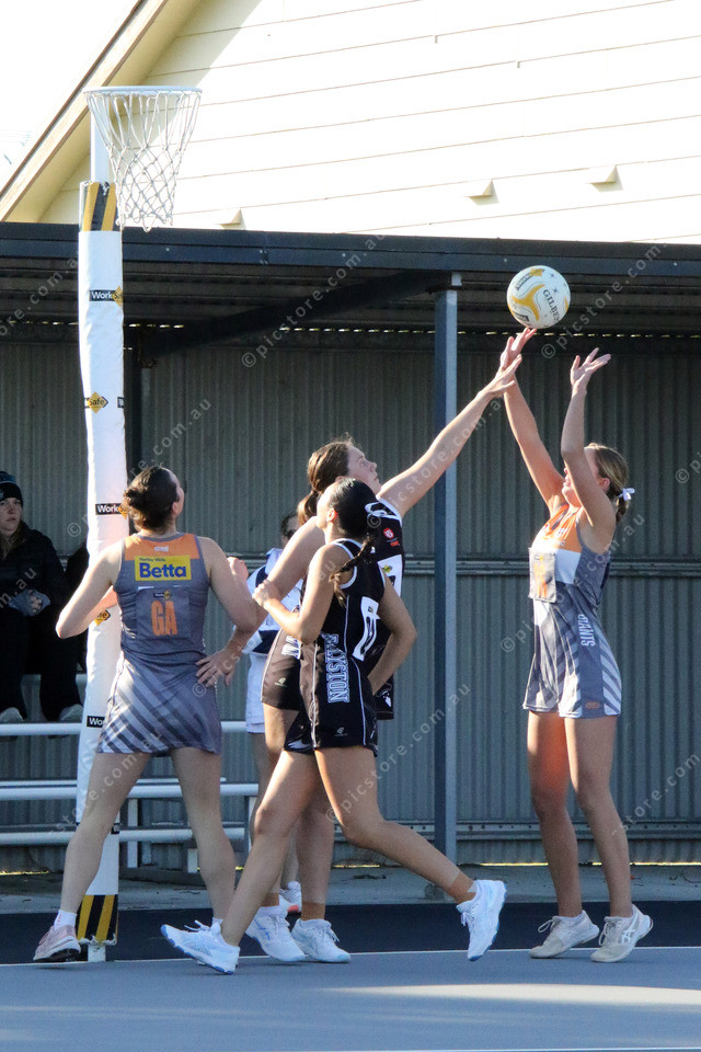 Mackeena Whiteside shoots for goal as Gemma Thomas Defends (Picture Nadine Smith NSM Images) 485547_23