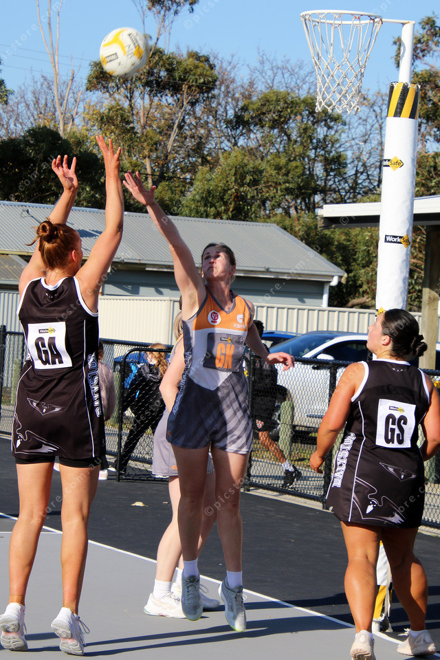 Giants Goal Keeper Fiona Burns defends Dalyston Britt Thomas (Picture Nadine Smith NSM Images) 485547_24