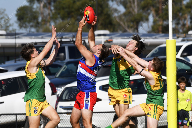 Star defenders Will Pickering, Jett Pickering and Chris Diston can’t stop Jack Taylor from marking the footy deep in the forward line. 471321_03