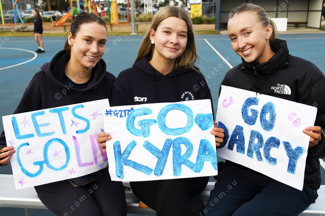 FOOTY SHORTS Nar Nar Goon’s Lucy, Grace and Chloe showing their support for Olivia Hamilton, Kyra Esler and Darcy Utber for Buddy Round at the Goon. 484169_08