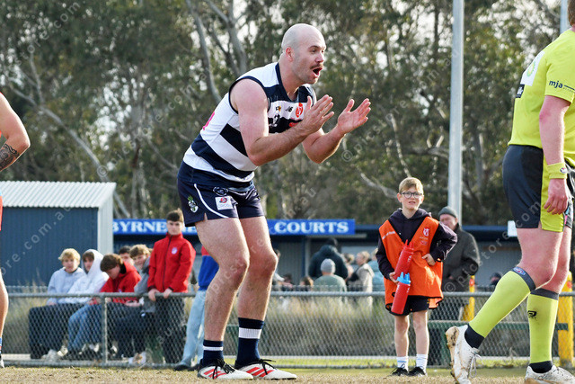 Bailey Rice can not believe Harrison Brain’s set shot at goal was given a behind on the halftime siren. 484169_34