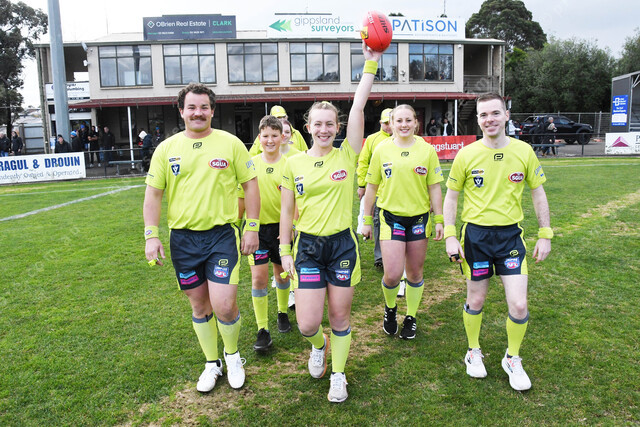 FOOTY SHORTS Gemma Cook holds the ball aloft and the siren sounds to signal the game is about to start 482701_04