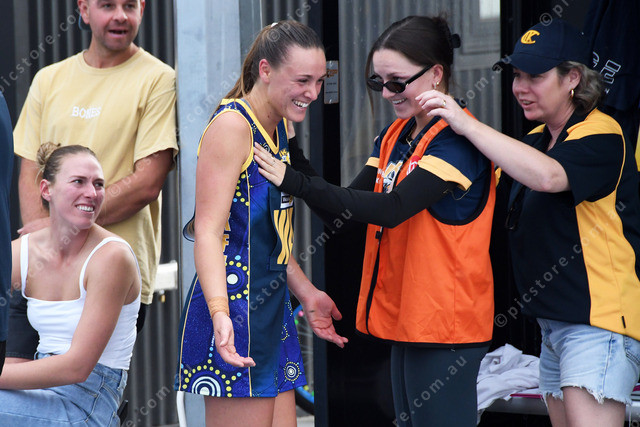 The umpire sends Sophia Hughes to the bench for a minor facial bleed and is attended to by Lanni Pryor who seemed to have trouble finding it. 473046_07