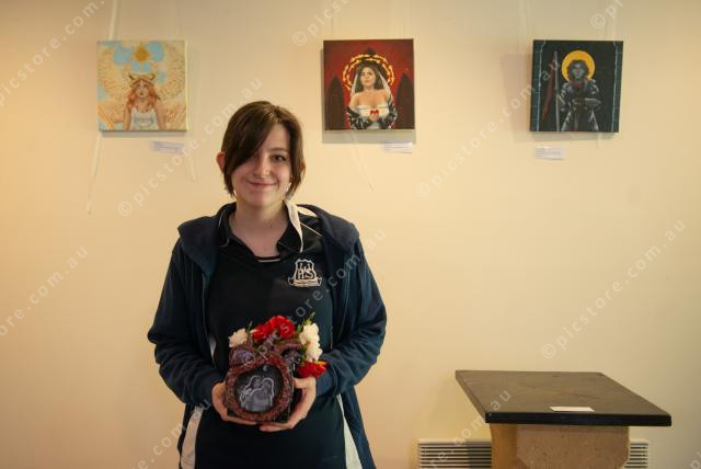 MIXED MEDIA: Willunga High School student Mars has paintings and a terracotta sculpture in the show. Photo: Dani Brown. 375634_02