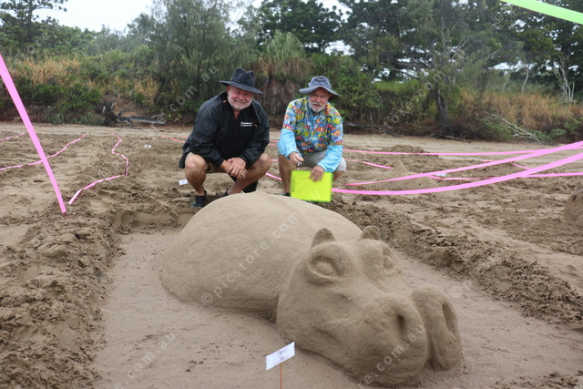 Councillor Rhodes Watson and Lion Peter Roper judging the sand sculpture competition.