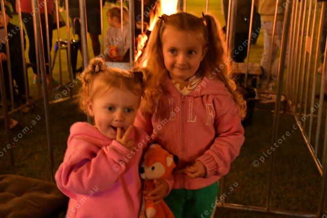 Enjoying the warmth of the firepit at Winterfest for SALA 2025 at Memorial Park were Ava and Vallie from Wallaroo (Neralie Bailey: 494018_11)