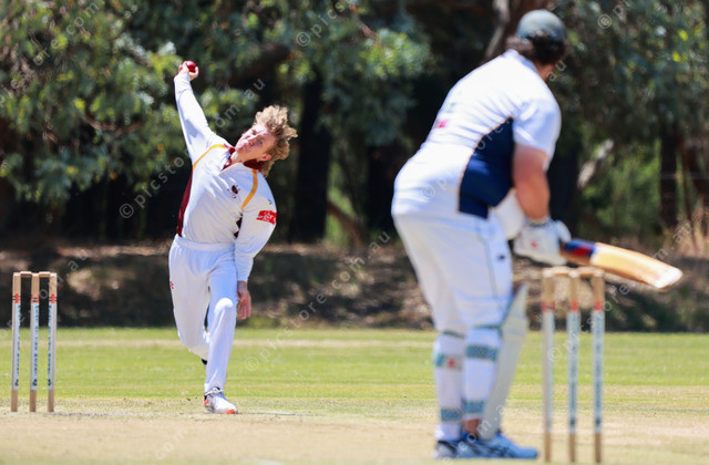 Mount Compass pace bowler Colby Endersby hits his marks in the B Grade against Encounter Bay. (Jesse Ehlers 529332_17)