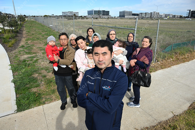 Pic of Cr Larry Zhao (front) with some of the local residents, he is calling on the state government to build a school in Williams Landing. (Damjan Janevski). 493128_01