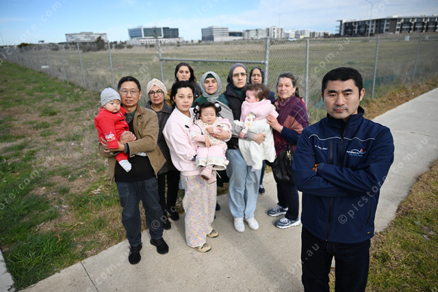 Pic of Cr Larry Zhao (front) with some of the local residents, he is calling on the state government to build a school in Williams Landing. (Damjan Janevski). 493128_04