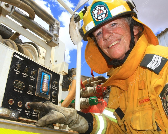 TEST: Jen Hamilton pushes the start button to check a pump on a NT Bushfire’s unit. (PIC: PHIL WILLIAMS 465716_08)