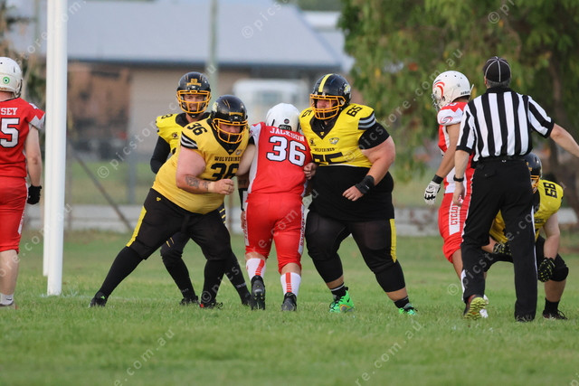 Rockhampton’s XXXX and Raymond Wheeler combine for a block on a Townsville’s defender.