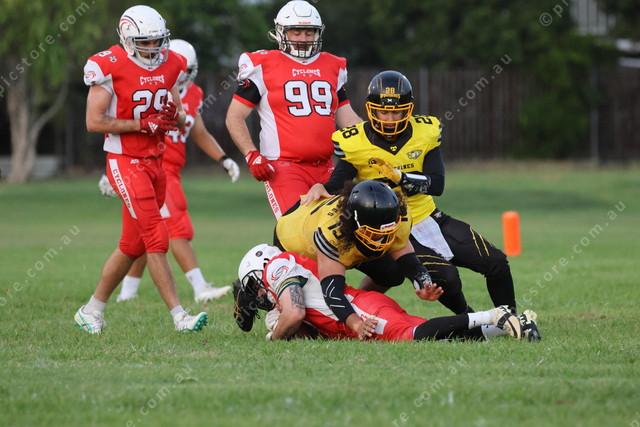 Marcus McKean and Caleb Brown dive on a Townsville player.