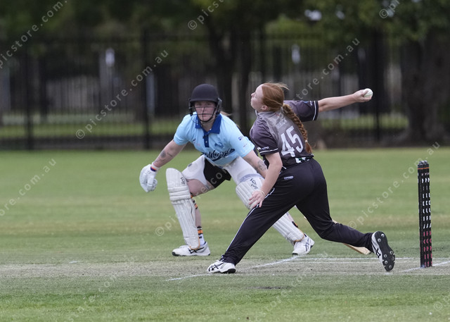 Eden Trinick in bowling action in the match between Mildura Settlers CC Women and Merbein CC Women at Mildura Senior College in Mildura on Friday 24 October, 2025.