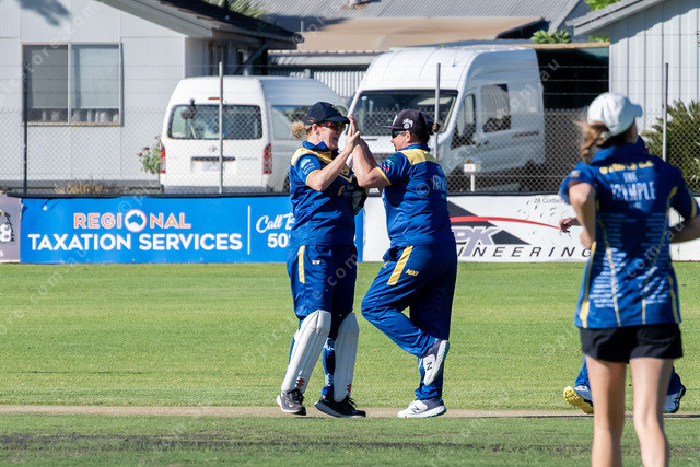 Wicket keeper Jo Wood and captain Kristy Carter celebrate the wicket of East opener Sonia Drew. Picture: Ben Gross