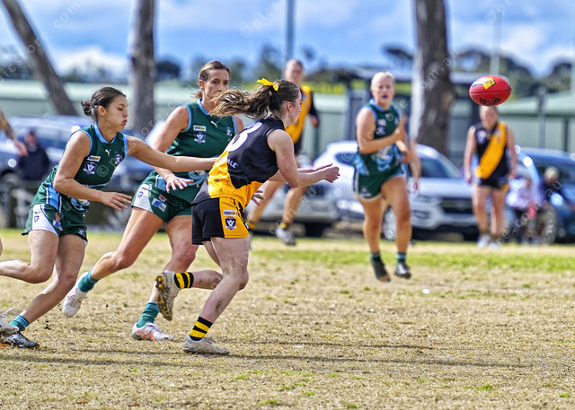 Ella McDonald handballs out of the centre (Ivan Kemp) 499130_01