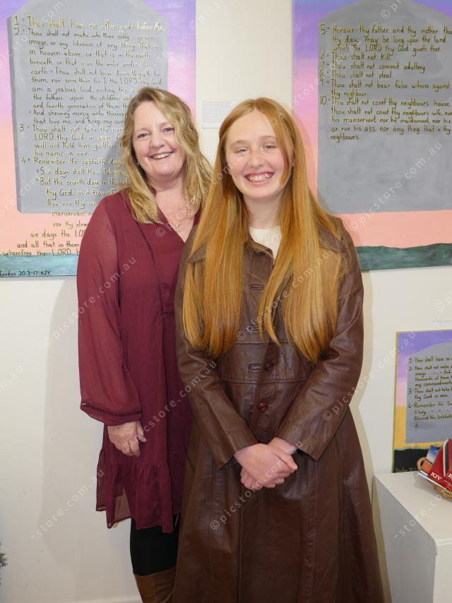 Linda Oakley ‘Wind of The Spirit’ with home schooler Selene Boughen standing in front of her acrylic painting of the Ten Commandments. 488563_06