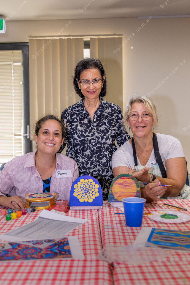 L-R Sam Igoe (Community Support Worker with the Uniting Church, Sha Yamin (Instructor Pakistani Truck-Art) and Sue Ann (Art Commitee).