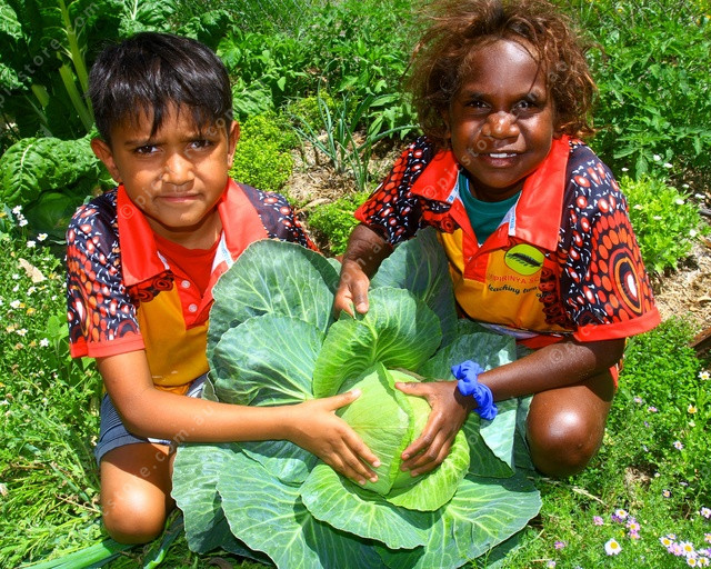 COLESLAW: DJ and Zoe in the Yipirinya School garden with giant cabbage. (PIC: PHIL WILLIAMS 510709_03)