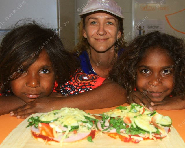 THE LOT: Brendan and Nola with EON Project Manager, Clare Cathell, eye off fresh pizzas made with ingredients from the school’s garden (PIC: PHIL WILLIAMS 510709_05)
