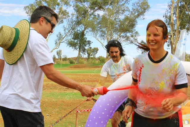 SMILES: A runner is all smiles as she gets sprayed with more powder. (PIC: PHIL WILLIAMS 527480_07)