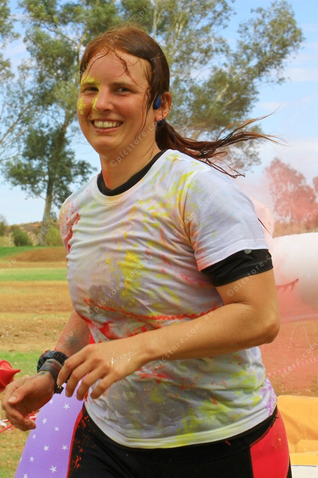 BEDRAGGLED: A smiling runner looking bedraggled after being soaked and covered in powsder during Yulara’s colour run. (PIC: PHIL WILLIAMS 527480_08)